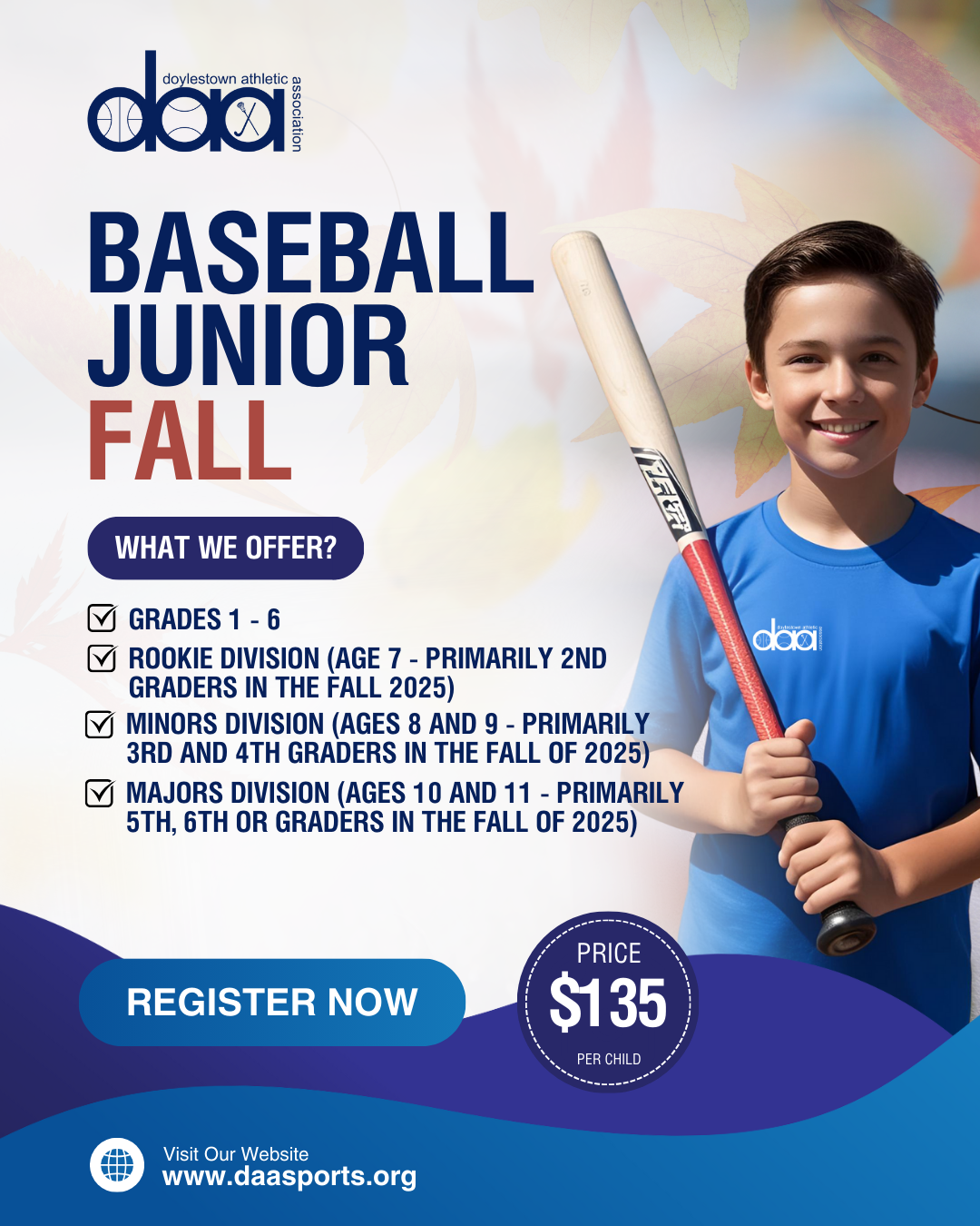 Welcome to the DAA Junior Fall Baseball Program, where young athletes 1st through grade 6 can enhance their skills, make new friends, and enjoy the excitement of America’s favorite past time!