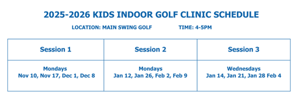 Our classes for the spring are on Mondays for just $140, covering four enriching sessions at the state-of-the-art Main Swing Golf facility. With a limit of 8 spots per session, we ensure a personalized learning environment. This is your chance to kickstart your child's lifelong journey in golf with our unforgettable Indoor Golf Clinics. Don't miss out!