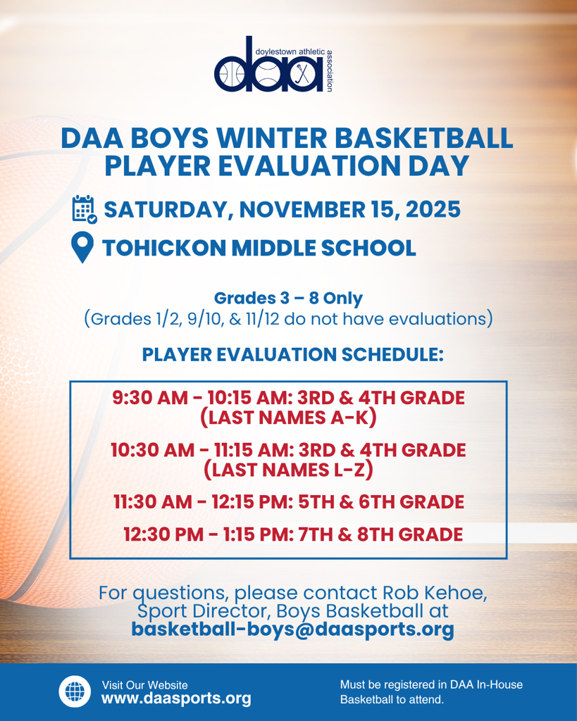 Welcome to DAA boys basketball. I'm Rob Kehoe and I'm entering my 8th year with the program and 4th as basketball director. We offer intramural programs for grades 1st-12th. All activities take place at local CBSD gyms. We offer a more competitive travel basketball program for grades 3rd-8th. Any additional questions you may have, please reach out.